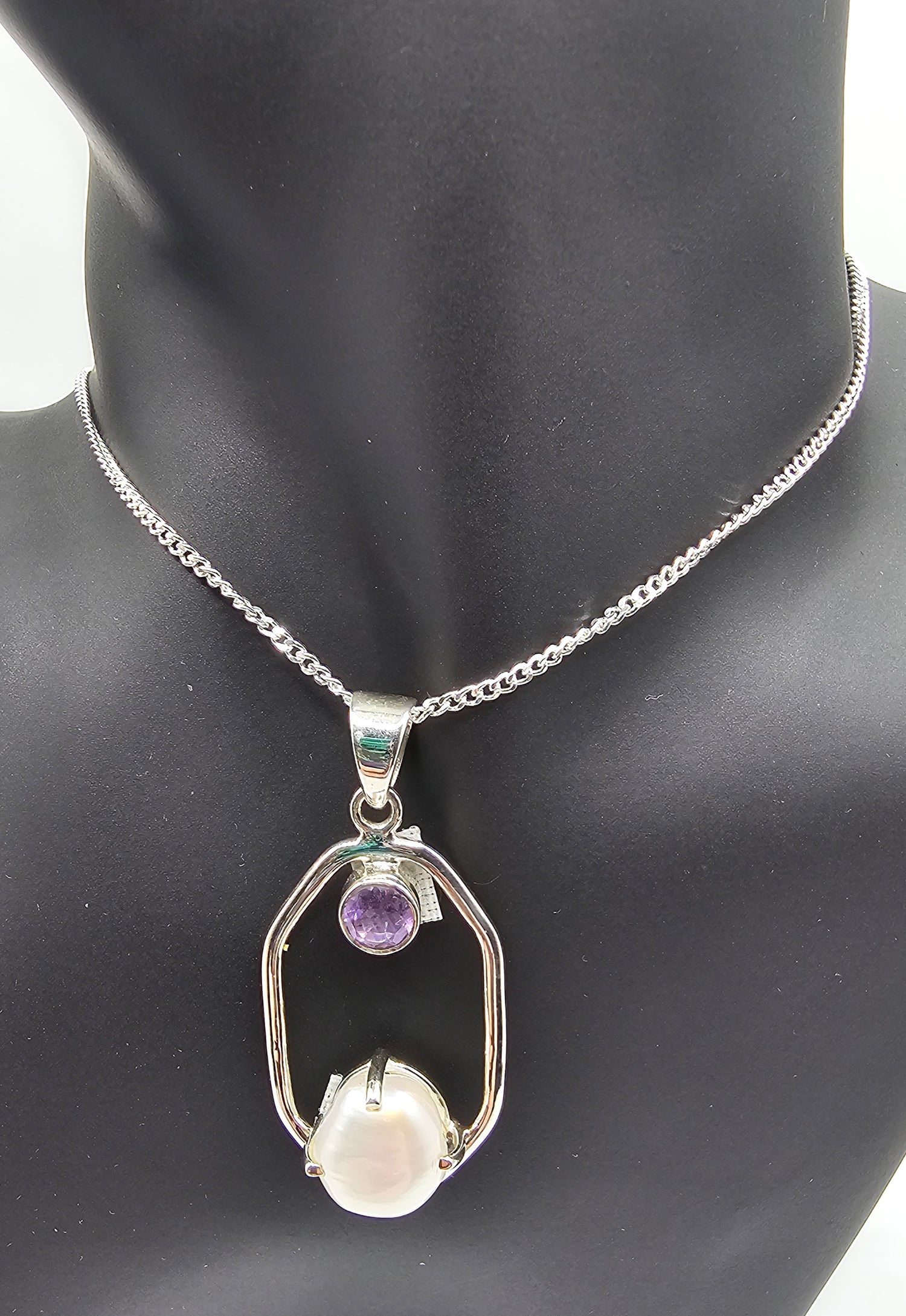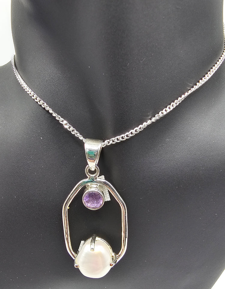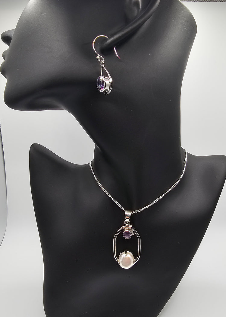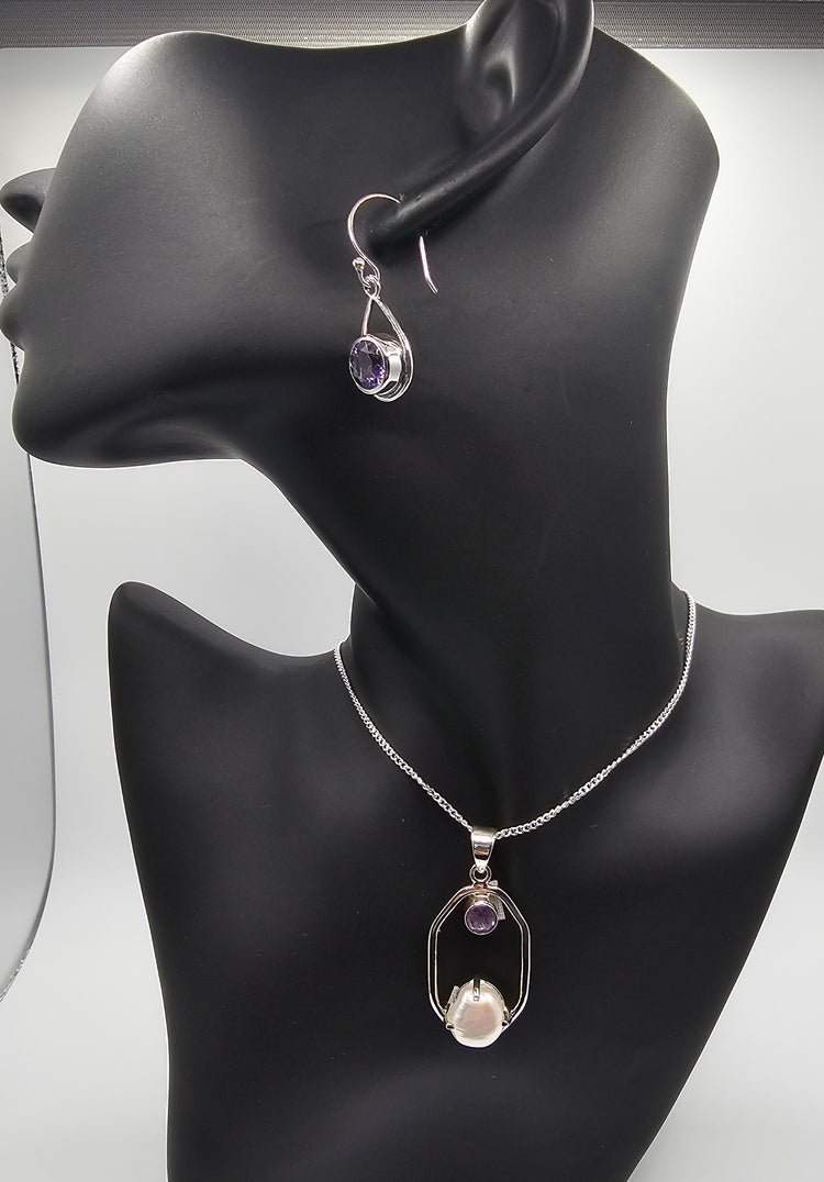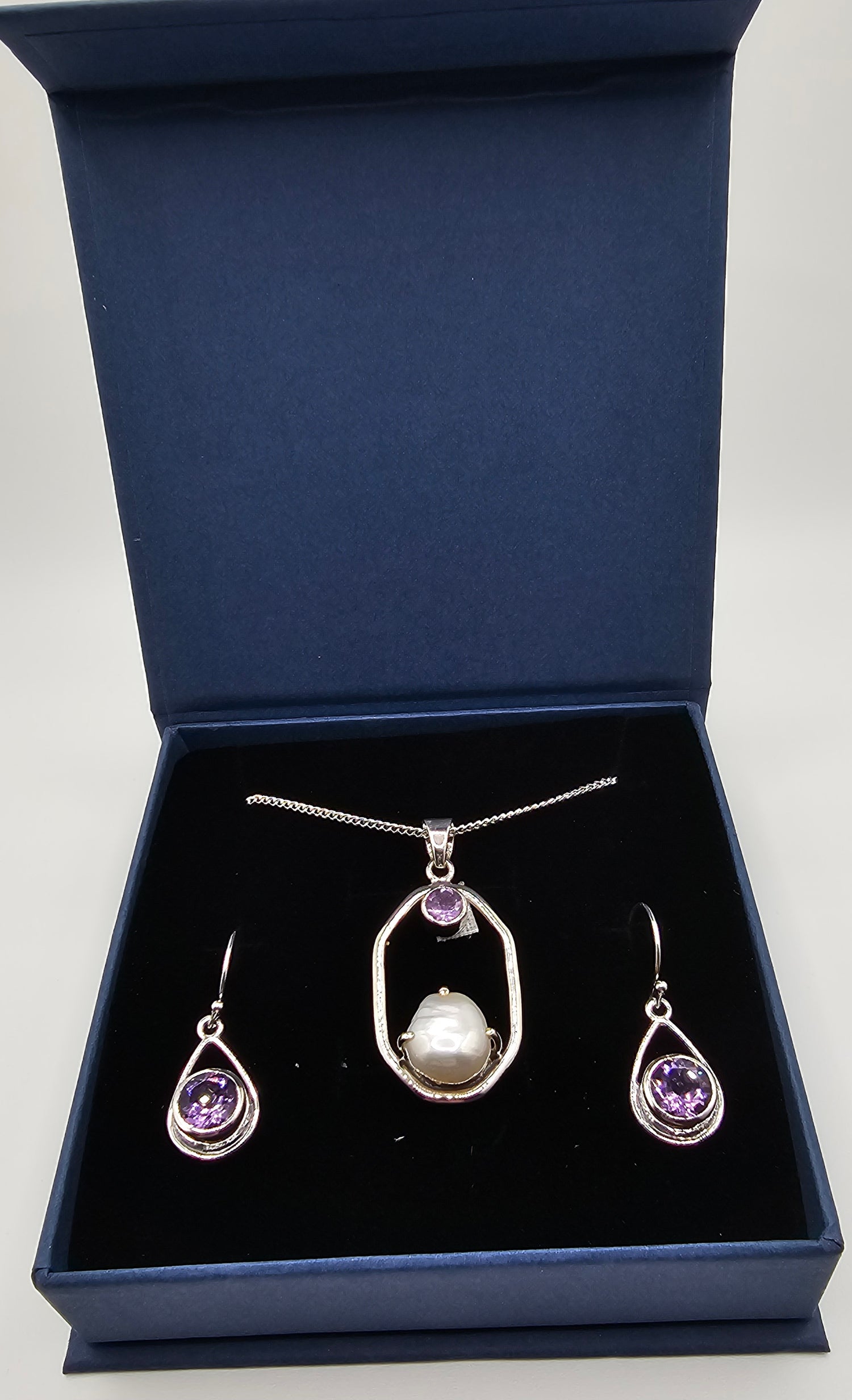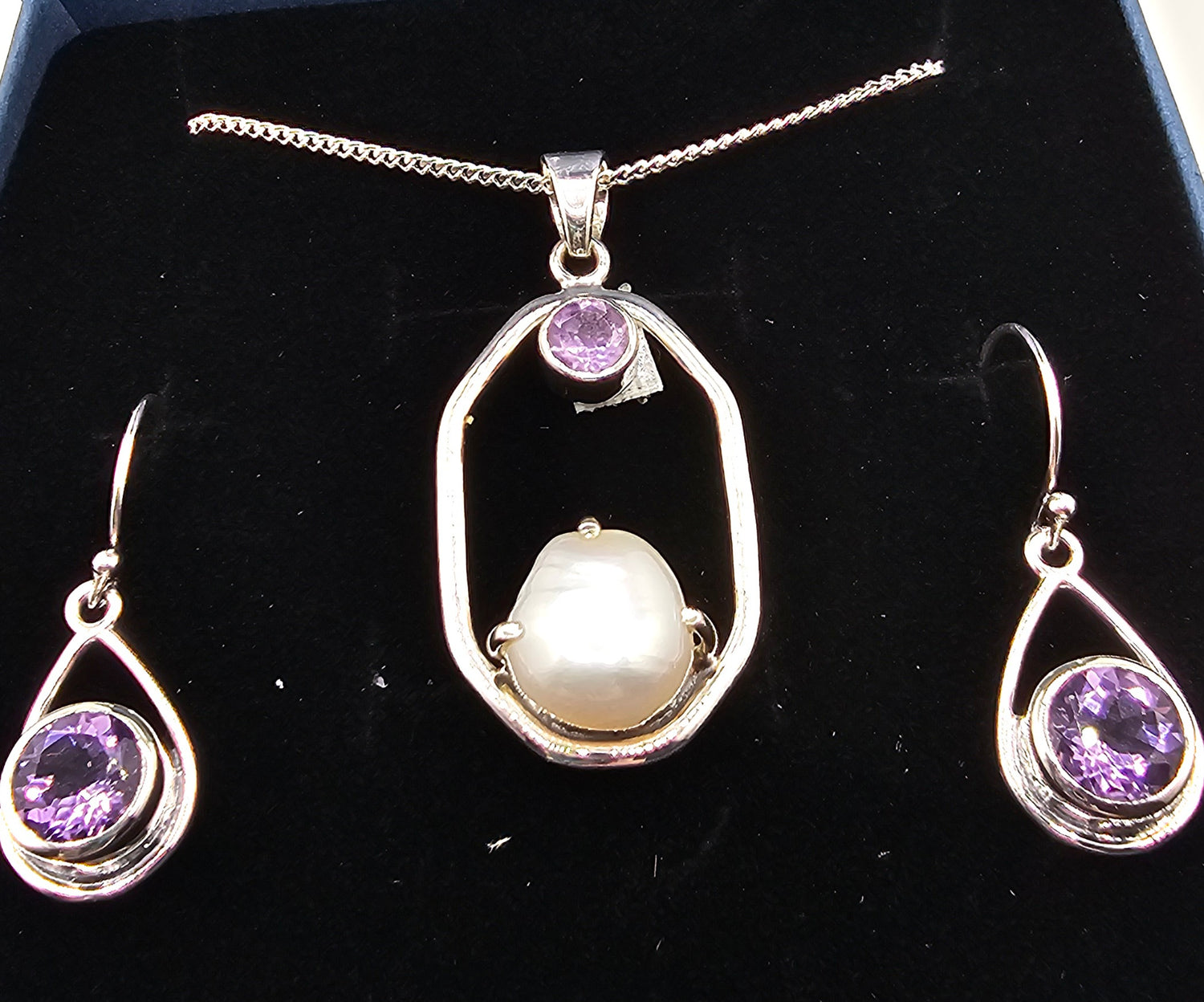 India Gems Amethyst and Pearl Earrings with Matching Pendant and Chain